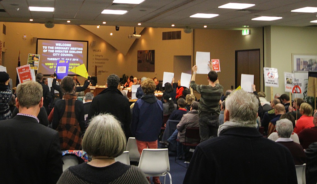22 July 2014: Before the City of Greater Geelong council meeting. Right-click on photo and use drop-down menu to download22 July 2014: Before the City of Greater Geelong council meeting.22 July 2014: Greater Geelong council meeting.22 July 2014: There was a very loud applause from the audience of 150 concerned Geelong citizens who attended the council meeting on Tuesday evening whenever a question had been asked to the Geelong councillors about whether the invasive gas mining and fracking industry will be allowed to begin its toxic industrialisation in areas of City of Greater Geelong and about the council’s community consultation procedures.Alan Manson, Frack Free Grovedale.